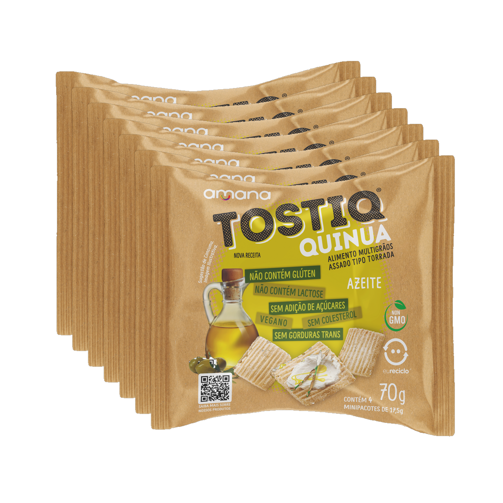 Ingredientes: Farinha integral de quinua, farinha integral de aveia, farinha de arroz, farinha de milho enriquecida com ferro e ácido fólico, aroma natural de azeite, azeite, sal e edulcorante maltitol. ALÉRGICOS: CONTÉM AVEIA. NÃO CONTÉM GLÚTEN.