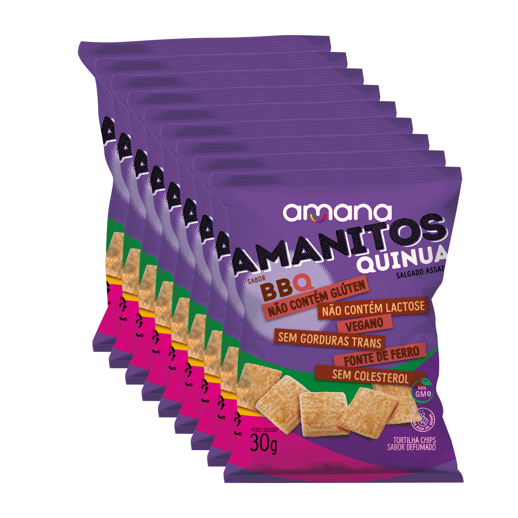 Ingredientes: Farinha de milho enriquecida de ferro e ácido fólico, farinha integral de quinua, sal, cúrcuma, extrato de levedura, aroma natural defumado, cloreto de potássio e acidulante ácido cítrico. ALÉRGICOS: PODE CONTER AVEIA. NÃO CONTÉM GLÚTEN.